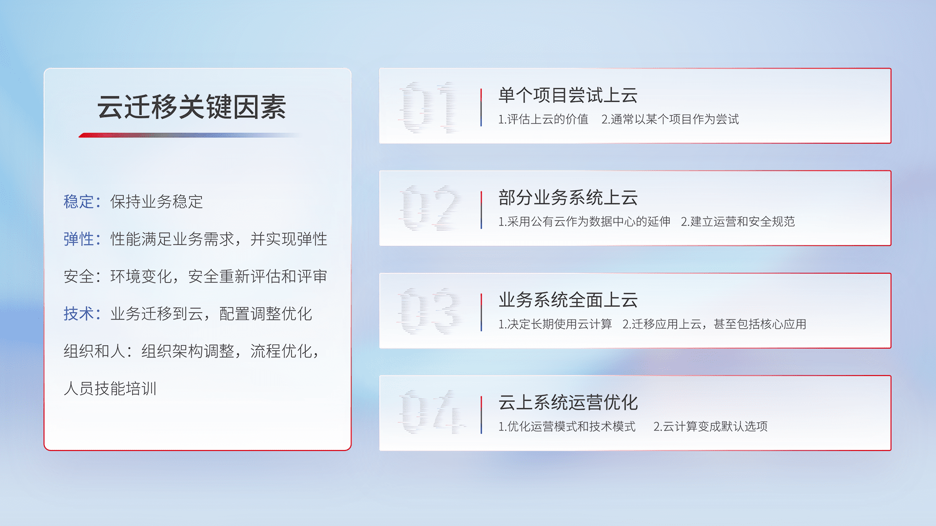 结合实际业务,,,从规划设计、、云平台选型、、云原生改造、、、数据迁移、、、、集成交付,,,迁移全过程为客户识别最佳上云路径,,,,做好风险识别管理,,,设计网络架构、、、身份权限、、安全审计合规、、操作审计、、、日志审计、、监控告警策略、、、多站点容灾设计等,,,对云上基础设施进行整体规划,,,提升IT治理水平,,以满足弹性、、、、高可用、、高性能的需求。。